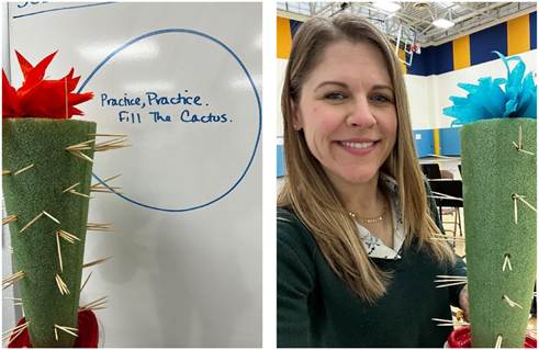 The Practice Cactus is a simple thing to make with Styrofoam, a flower pot, and toothpicks for needles. The cactus is a tangible representation of student practice time and the students take pride in adding their needle to the cactus each week.