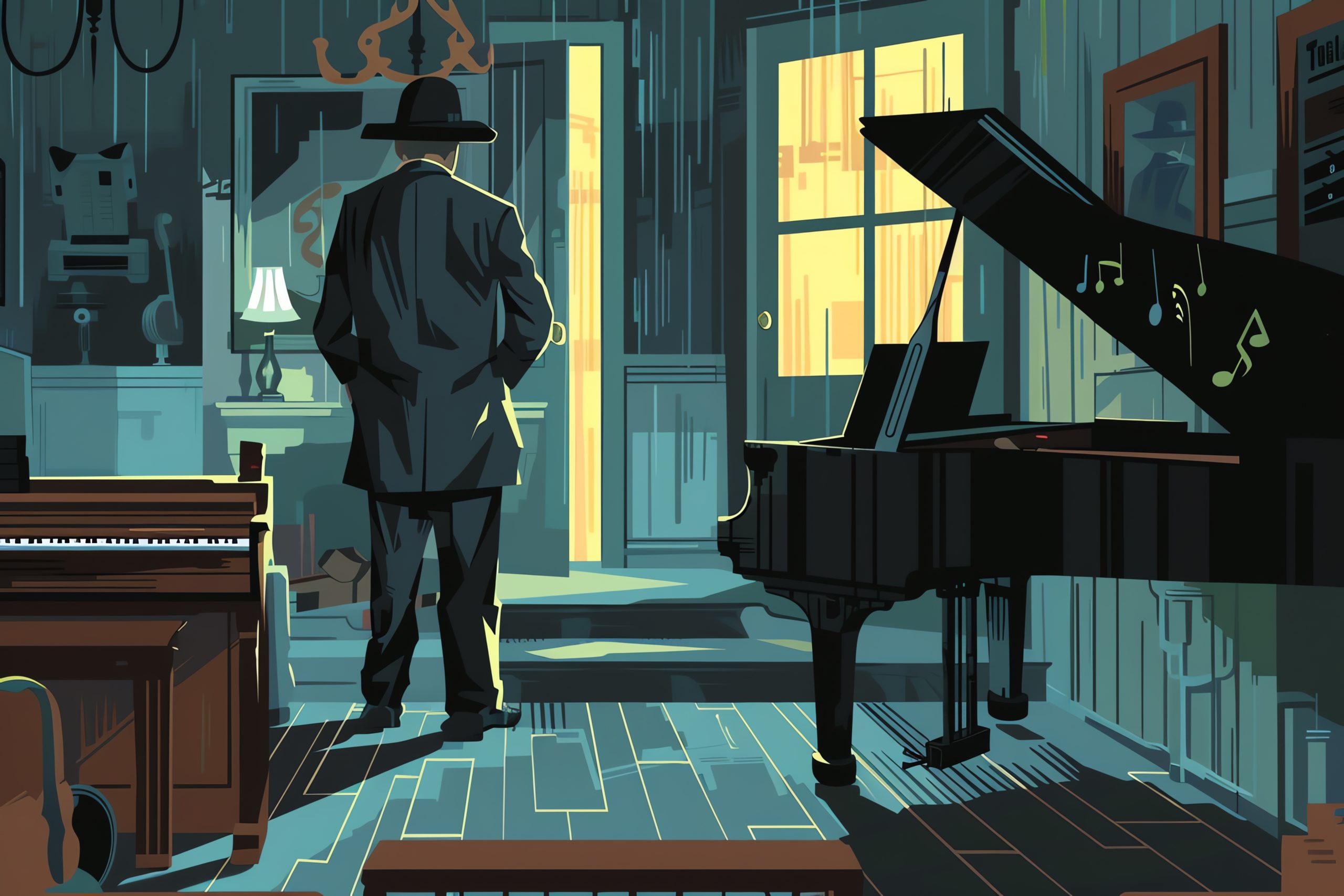 Illustrate a detective solving a crime using vector art, incorporating musical notes and instruments cleverly into the scene Show an unexpected camera angle from a surveillance camera, enhancing the suspense in the storyline