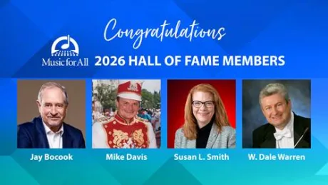 Music for All announces the 2026 Hall of Fame inductees, Jay Bocook, Mike Davis, Susan L. Smith, and W. Dale Warren. Music for All’s Hall of Fame recognizes individuals who have significantly impacted Music for All, its programs, and music education in America. Members represent impeccable character, ethics, and professionalism, and are role models for music education professionals.