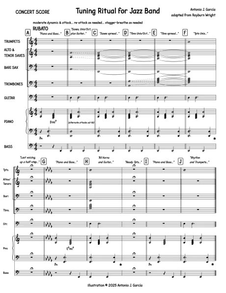 At letter A the piano plays a Dm9 chord, hitting A’s on top. The bassist repeatedly plays a low D. Letter B cues the saxes to tune unison/octave A’s; the guitar adds D’s. Take as long as the saxes need to get in tune! Once tuned, the saxes spread on my cue at letter C to a voicing of concert (bottom to top) D F (middle) C E A. At letter D the bones add unison A’s (perhaps bass bone on low A). Take as long as the bones need! Once tuned, then spread at letter E to notes F A (middle) C E. At letter F the trumpets add unison A’s. I don’t spread them. Once they are in tune, I cut off the band, then cue everyone to think about taking their last voicing up a half step.